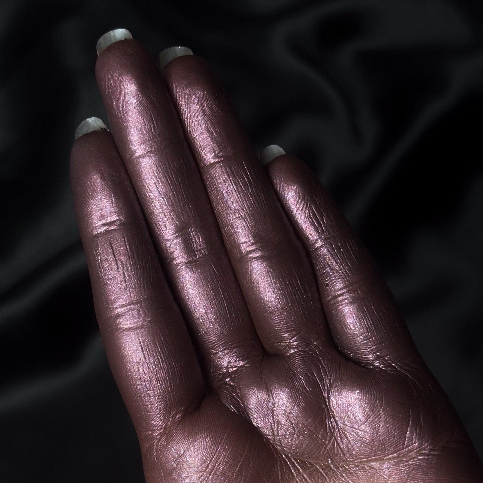 Mystic Sheen: The ultra-smooth formula transforms into a hyper-reflective, molten metallic finish reminiscent of moonlight. Apply dry for a soft, luminous veil or dampen for dramatic, high-shine opacity. Expect intensely rich pigment.